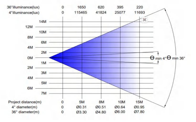 LIGHT SOURCE ● LED: 700W 8000K WHITE OPTICS ● Beam angle: 4°~36° DYNAMIC EFFECTS ● Color: 1 color wheel, 7 colors + white CONTROL ● Protocols: USITT DMX512, RDM |