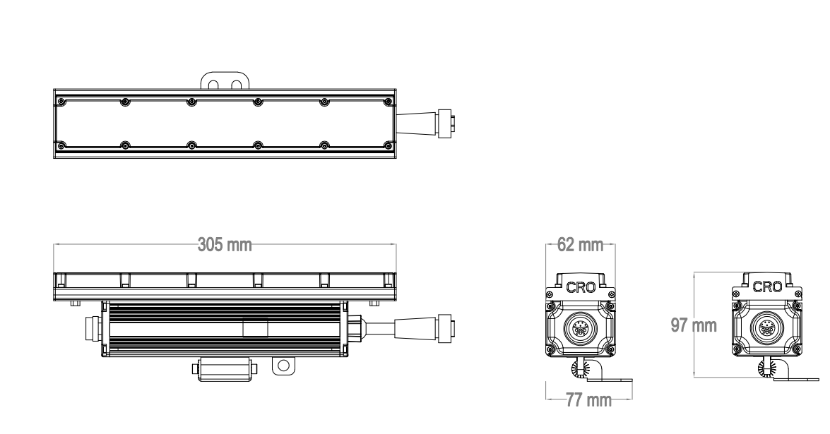 ELECTRONICS ● Dimmer: linear 0 ~ 100% 24 bit electronic dimmer ● Storage Temperature: -40 °C to 85 °C (device must reach start-up temperature ● Start-up Temperature: -25 °C to 50 °C ● Operating temperature: -40 °C ~ +50 °C ELECTRICAL ● Mains power supply: 90-277VAC, 50/60Hz((optional, 24VDC) ● Max power consumption : 30W, optional(5W/15W) PHYSICAL ● Material: extruded aluminum + PMMA top lens ● Finish: Finished aluminum, gray(RAL 9006), black (RAL 9005), white (RAL 9003) or custom colors (provide RAL #) ● Cooling: convection, overheating protection ● Connection: 8-pin integrated DMX & POWER in&out with IP connectors ● Dimensions: 305x62x97 mm(including bracket) ● Weight: 1.0kgs ● IP rating: IP67 CERTIFICATIONS ● Certifcations: CE, RoHS, 3G Standard Included ● 1x GrazeONE S ● 1x Manual ● 1x Safety Cable Optional Accessories ● End Terminal Cap ● IP 8-Pin Extension Cable ● Power+Data Box ● Glare Shield ● Louver ● Wall-mounted sets ● Hanging sets