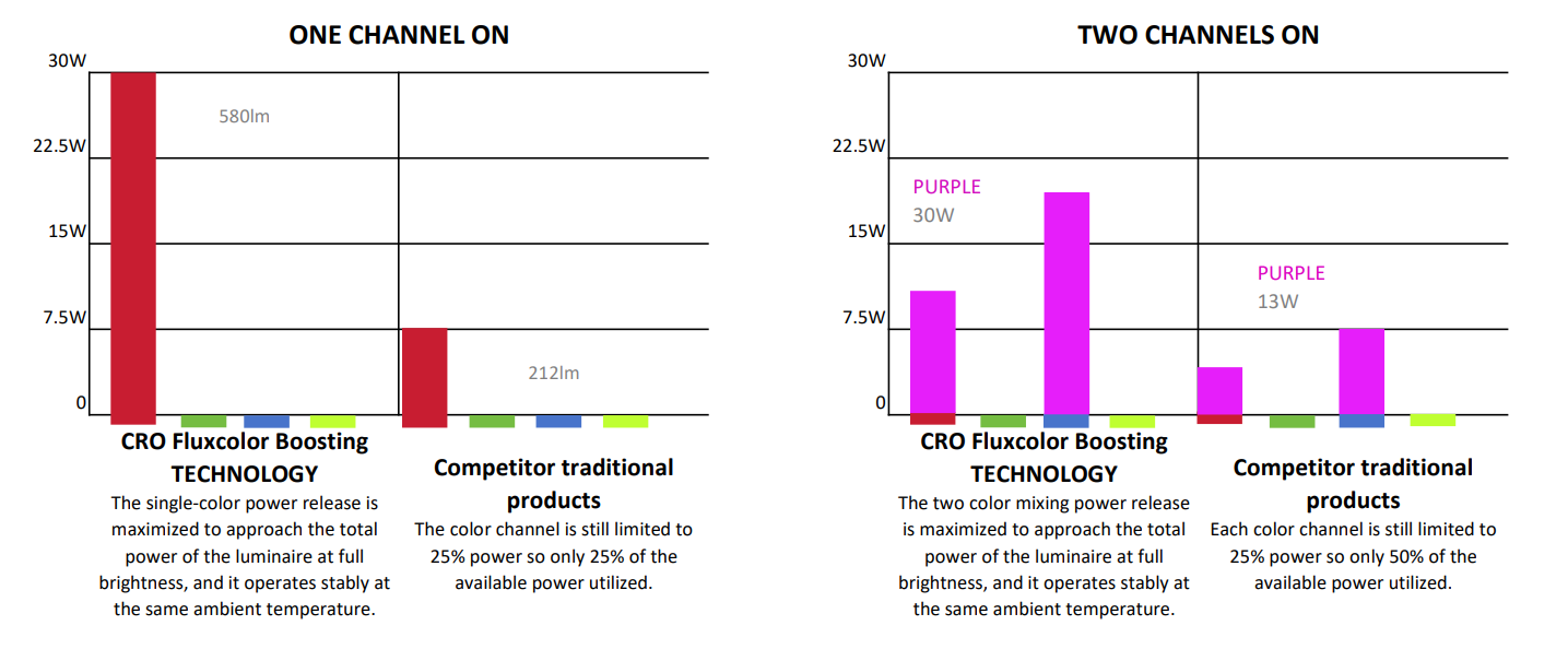 Fluxcolor boosting technology is a sophisticated software algorithm integrated into CRO multi-channel light fittings. It optimizes the use of the luminaire's available power to deliver peak brightness for individual colors (R, G, B) as well as their combinations, all within the luminaire's total maximum power limit. Since the luminaires maximum power remains constant, there is no requirement for extra cables or power supplies in the project design.